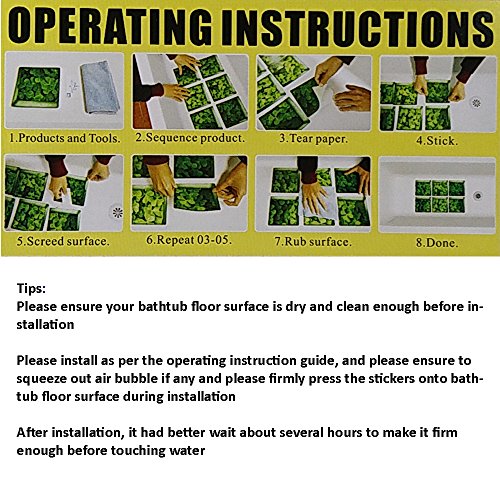 Attention please: (1). Please ensure your bathtub floor surface is dry and clean enough before installation. (2). Please install as per the operating instruction guide, and please ensure to squeeze out air bubble if any and please firmly press the stickers onto bathtub floor surface during installation. (3). After installation, it had better wait about several hours to make it firm enough before touching water.