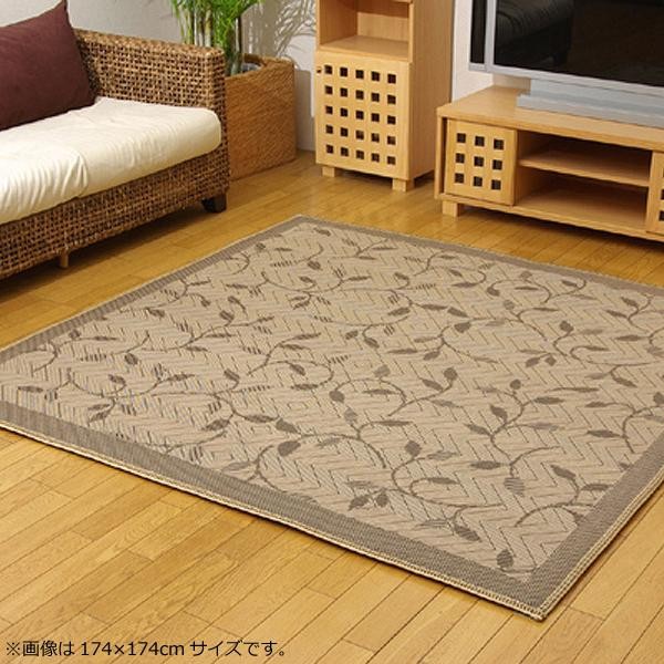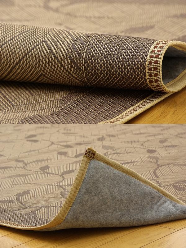 麻の一種であるジュート糸と、ポリエチレン糸のジャガード織のカーペットです。裏面にはフローリングを傷つけにくいよう不織布を貼っています。また、中材にはウレタンを使用しているのでクッション性があります。 |
