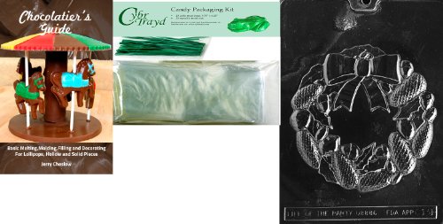 Cybrtrayd Mdk25GRBk-C131 Wreath Chocolate Mold with Chocolatier's Bundle of 25 Cello Bags, 25 Green Twist Ties and Chocolatier's Guide