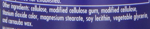 Other Ingredients: Cellulose, modified cellulose gum, modified cellulose, titanium dioxide color, magnesium stearate, soy lecithin, vegetable glycerin, and carnauba wax.