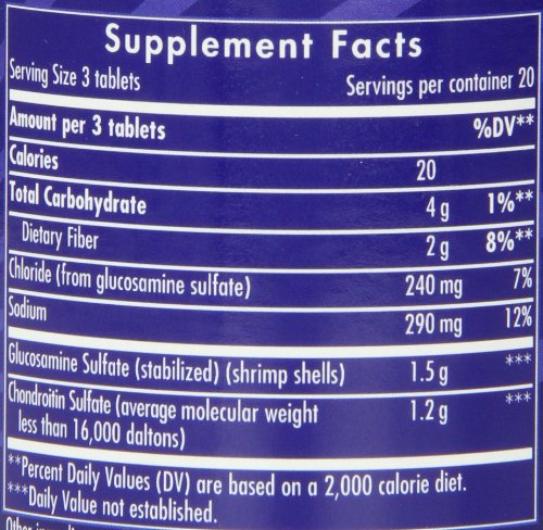 Amount Per Serving% Daily Value***Calories20Total Carbohydrate4g1%**Dietary Fiber2g8%**Chloride (from glucosamine sulfate)240mg7%Sodium290mg12%Glucosamine Sulfate (stabilized) (shrimp shells)1.5g*Chondroitin Sulfate (average molecular weight less than 16,000 daltons)1.2g*
