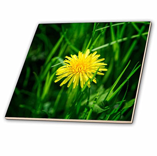 3dRose Yellow Dandelion Flower, Green Grass Tile, 8 x 8"