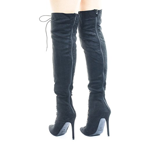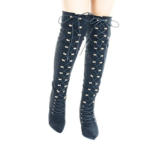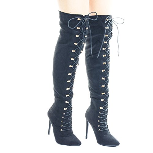 Binding : Apparel Product Description About This Shoes :These military inspired boots features full frontal lace up closure, pointed toe, high thin heel, rear full zipper and faux suede upper. The front tongue is sewed in and not movable. Brand - Forever Link Colors Available: Black Occasion: Formal Shoe Type: Over Knee Boots Shoe Style: Over Knee Boots Inner Lining: synthetic Heel Height In Inches - 4.5 Heel Style - Stiletto Toe Style - pointed-toe Platform Height In Inches - Shaft Height In Inches - 21 Circumference Opening - 16 Strap Type - 0 Sole - manmade All Man Made Material unless otherwise stated. Computer/Phone/Table monitors might show color differently because of its quality or calibration, we suggest you look at the photo in at least 3 monitors if you need exact color match of your shoes. 0