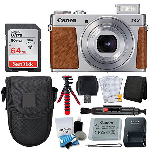 Canon PowerShot G9 X Mark II Digital Camera (Silver) + SanDisk 64GB Memory Card + Point & Shoot Case + Flexible Tripod + USB Card Reader + Cleaning Kit + LCD Screen Protectors + Full Accessory Bundle