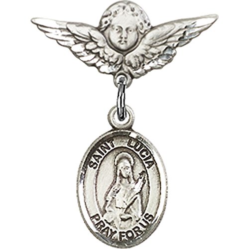 -. Title : Sterling Silver Baby Badge with St. Lucia of Syracuse Charm and Angel w/Wings Badge Pin 7/8 X 3/4 inches