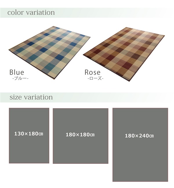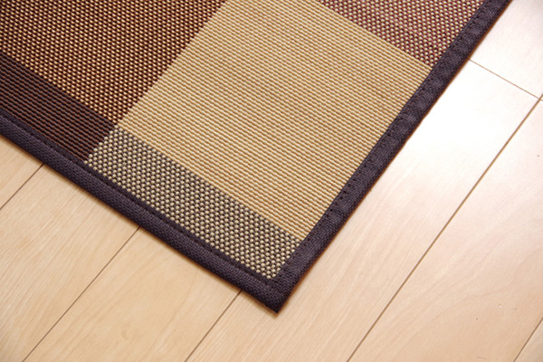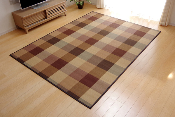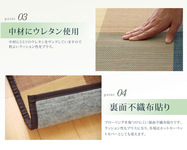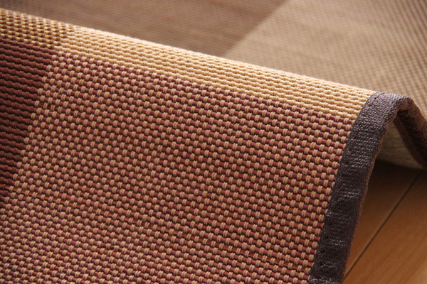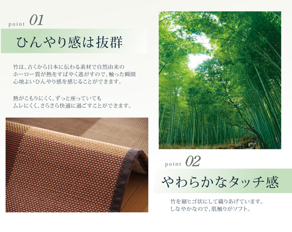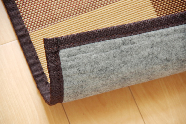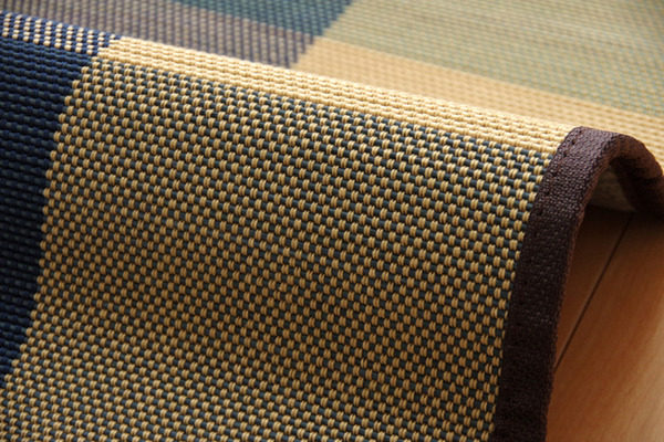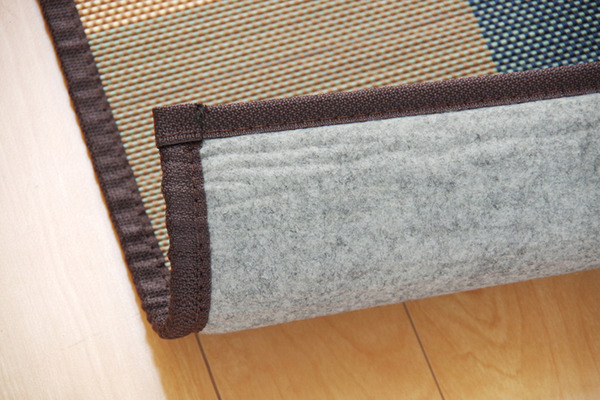 2.5mm細ヒゴを使用したバンブーラグです。竹は耐久性に優れ、熱伝導率が高いため自然のひんやり感があります。縦糸にカラー糸を使用し柄を出したデザイン織りです。またクッション性にこだわり、中材にはウレタン5mmを使用しています。裏には不織布を貼っていますので、フローリングでのご使用に適しています。竹は他の木材と比べると、格段に成長が早く(3~5年で成竹)、持続的生産が可能な環境に優しいサスティナブルな素材です。