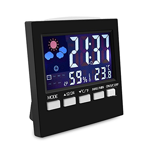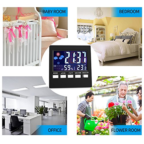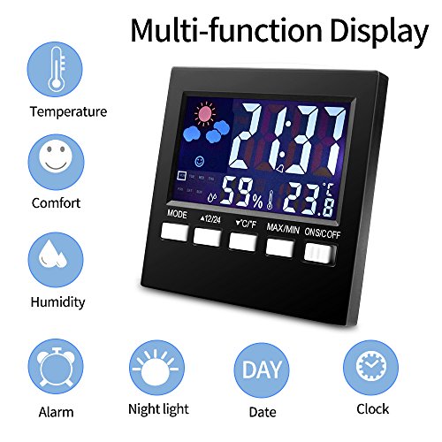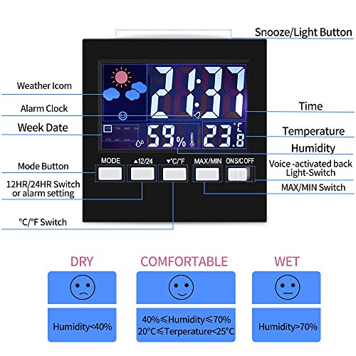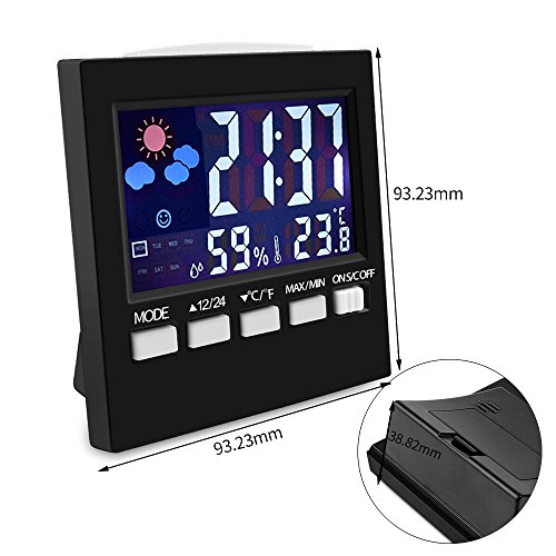 1. Temperature range : 0~50C 2. Temperature accuracy : /-1C 3. Humidity range : 10~99% 4. Humidity accuracy : /-5% 5. Dimension : 92X92X50MM 6. Power : 2XAAA(Not included) 7.12/24 H selection 8.package : 1 x Temperature and Humidity Monito 1 x User Manual
