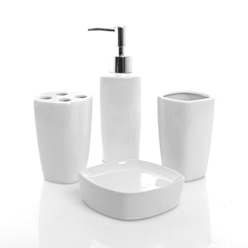 4 Piece White Ceramic Bathroom Set - Pump Soap Dispenser, Toothbrush Holder, Tumbler Cup & Soap Dish Tray