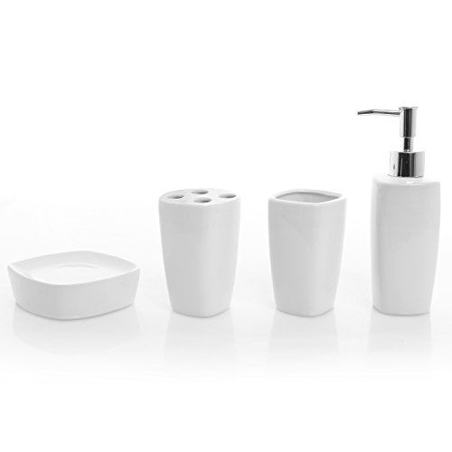 This set features 1 pump-top hand soap dispenser, 1 toothbrush holder, 1 tumbler, and 1 soap dish.