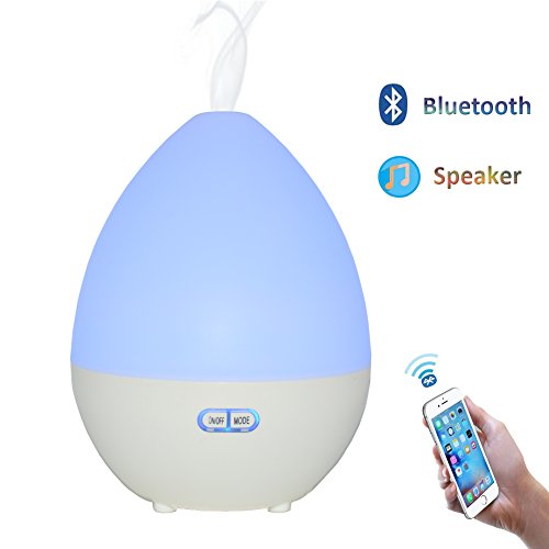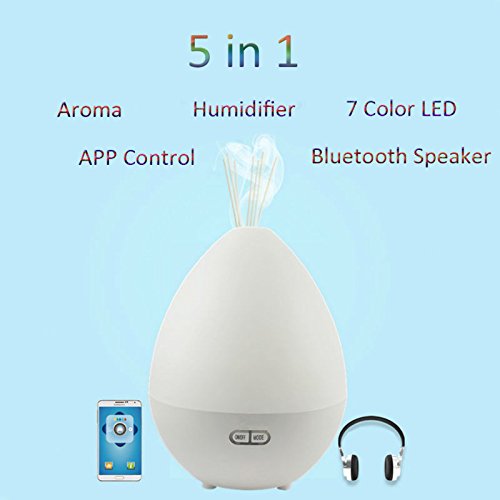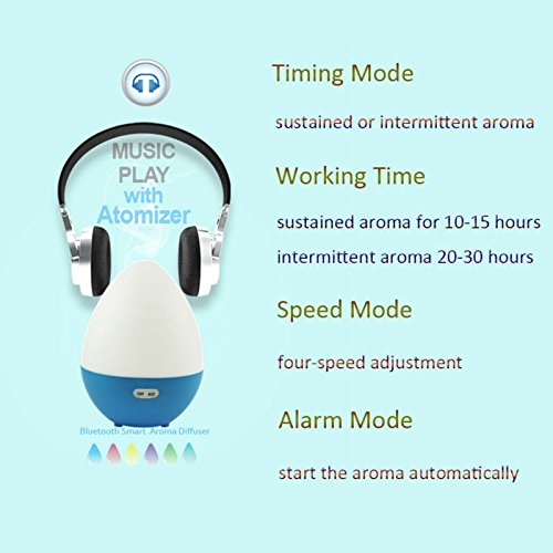 Blue-tooth Audio The humidifier can play music thro-ugh smart phone, tablet etc, by blue-tooth function, it will make you enjoy music freely and exempt from annoying wires stumbles. APP Remote control, timer aromatherapy / pause fragrance, aromatherapy alarm clock starts, four adjustble spray anhydrous reminders and water protection functions.