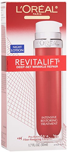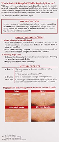 Diminish the appearance of deep-set wrinkles, like forehead and furrow lines and enjoy younger-looking skin. RevitaLift Deep-Set Wrinkle Repair is the first L'Oreal formula that specifically targets deep wrinkles from within by the power of Pro-Retinol A to reduce the size and depth of wrinkles. This luxurious cream nourishes and rejuvenates your skin while you sleep. In clinical tests, after 4 weeks women saw a reduction in wrinkles and that skin was noticeably firmer. After 8 weeks, deep-set wrinkles were visibly minimized and skin looked and felt younger.Feature