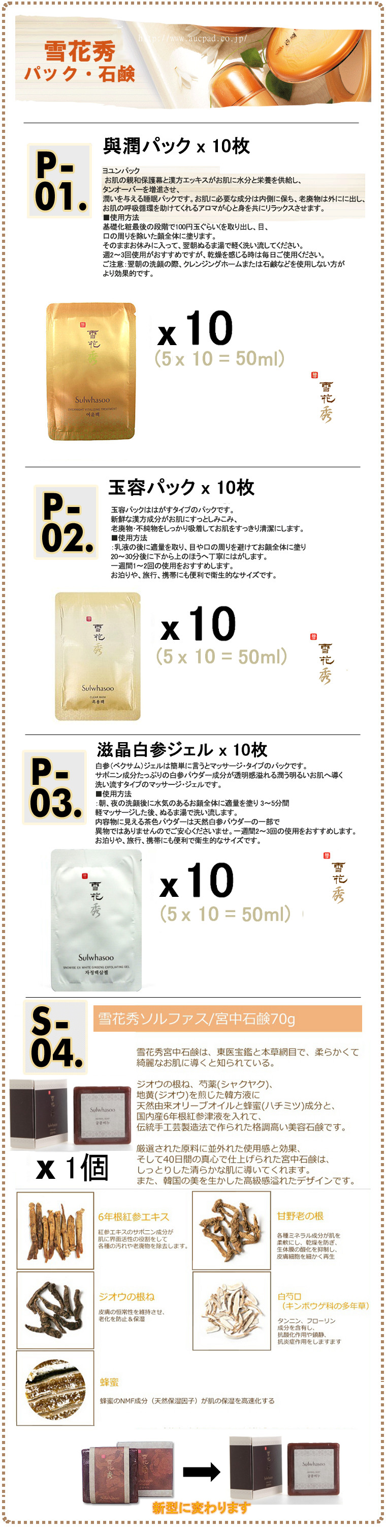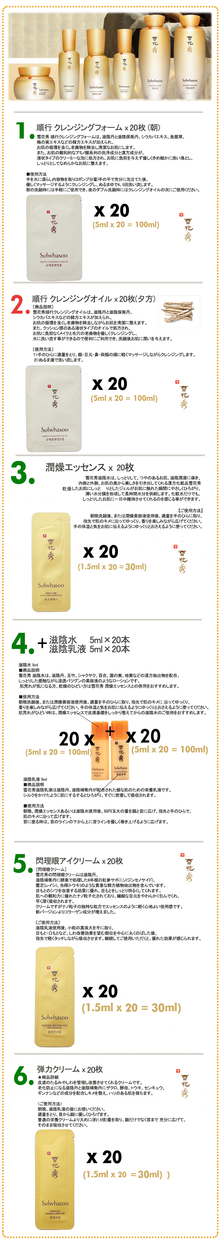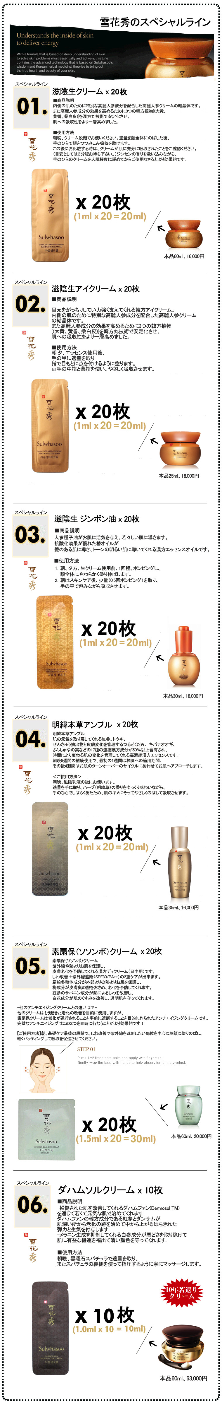 《雪花秀》ソルファスシリーズ雪花秀(ソルファス)は、30代以上の女性の肌を考えて作られた格調高い韓方化粧品です。 ●滋陰シリーズ(基本ライン) A1. 順行クレンジングフォーム 20枚 A2. 順行クレンジングオイル 20枚 A3. 潤燥エッセンス 20枚 A4. 滋陰化粧水 20個+乳液 20個 A5. 閃理眼アイクリーム 20枚 A6. 弾力クリーム 20枚 A7. 潤潔エッセンス 20枚 ●滋晶シリーズ(美 白ライン) B1. 滋晶美 白エッセンス 20枚 B2. 滋晶美 白クリーム 20枚 B3. 滋晶化粧水 20個+乳液 20個 B4. 常白クリーム 20枚 B5. 滋晶美 白スポットトリートメント 20枚 B6. 滋晶エッセンスBB(ナチュウラルベージュ) 20枚 B7. 滋晶クレンジングフォーム 20枚 B8. 滋晶スクラブジェル 20枚 ●水律シリーズ C1.水律エッセンス 20枚 C2.水律クリーム 20枚 C3.水律サンクリーム(日焼け止め、SPF 50+ PA+++) 20枚 C4.水律アイエッセンス 20枚 (使用順:潤燥エッセンス→滋晶化粧水→滋晶乳液→水律エッセンス→水律クリーム) ●珍雪シリーズ(アンチ エイジングライン) D1.珍雪エッセンス 20枚 D2.珍雪クリーム 20枚 D3.珍雪アイクリーム 20枚 D4.珍雪化粧水 10個+乳液 10個 ●スペシャルライン S1.滋陰生クリーム 20枚 S2.滋陰生アイクリーム 20枚 S3.滋陰生ジンボン油 (高麗人参種オイル) 20枚 S4.明緯本草(ミョニボンチョ)アンプル 20枚 S5.素扇保(ソソンボ)クリーム 20枚 S6.多箱雪クリーム(10年若返りクリーム) 10枚 S7.滋陰生クリームライト (滋陰生クリームのかるいタイプ) 20枚 ●石鹸・パック P1.與潤パック10枚(睡眠パック) P2.玉容パック10枚(はがすタイプのパック) P3.滋晶スクラブジェル10枚(マッサージタイプのパック) P4.青潤スーディングパック10枚 (オイルマッサージパック) P5.雪顔パック 5ml 10枚 (睡眠パック) P6.宮中石鹸 70g (高級韓方石鹸[新型]) ●ゴアライン G1.ゴアアンプル(美容液) 20枚 G2.ゴアアイ&リップクリーム 20枚 G3.ゴアクリーム 20枚 G4.弾力ネッククリーム(首周り) 20枚 ●ベースライン E1.CC乳液 ピンクベージュ 20枚 E2.CC乳液 ミディアムベージュ 20枚 E3.美顔フィニッシャー 20枚 E4.ジャヨジンエッセンス E5.メイクアップバランサー1号 ライトピンク 20枚 E6.メイクアップバランサー2号 ライトパープル 20枚 E7.メイクアップバランサー3号 ライトグリーン 20枚 E8.美顔フィニッシャー 20枚 (スキンケアの最後の段階に使用)