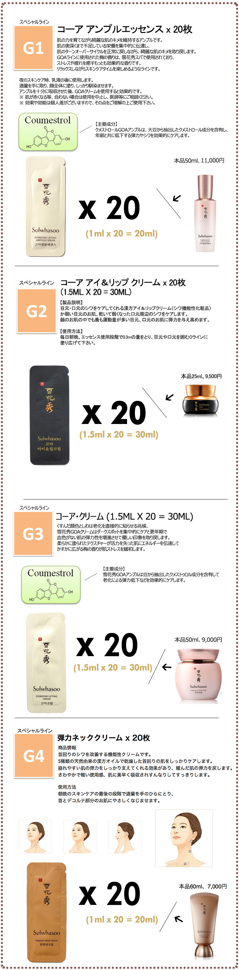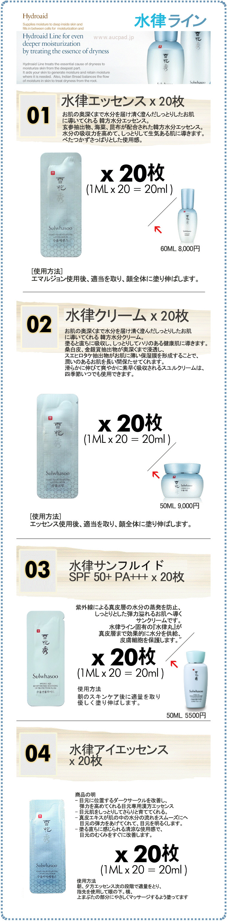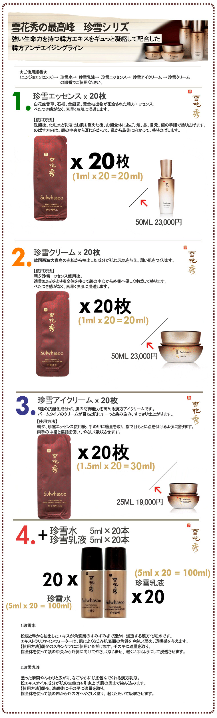 《雪花秀》ソルファスシリーズ雪花秀(ソルファス)は、30代以上の女性の肌を考えて作られた格調高い韓方化粧品です。 ●滋陰シリーズ(基本ライン) A1. 順行クレンジングフォーム 20枚 A2. 順行クレンジングオイル 20枚 A3. 潤燥エッセンス 20枚 A4. 滋陰化粧水 20個+乳液 20個 A5. 閃理眼アイクリーム 20枚 A6. 弾力クリーム 20枚 A7. 潤潔エッセンス 20枚 ●滋晶シリーズ(美 白ライン) B1. 滋晶美 白エッセンス 20枚 B2. 滋晶美 白クリーム 20枚 B3. 滋晶化粧水 20個+乳液 20個 B4. 常白クリーム 20枚 B5. 滋晶美 白スポットトリートメント 20枚 B6. 滋晶エッセンスBB(ナチュウラルベージュ) 20枚 B7. 滋晶クレンジングフォーム 20枚 B8. 滋晶スクラブジェル 20枚 ●水律シリーズ C1.水律エッセンス 20枚 C2.水律クリーム 20枚 C3.水律サンクリーム(日焼け止め、SPF 50+ PA+++) 20枚 C4.水律アイエッセンス 20枚 (使用順:潤燥エッセンス→滋晶化粧水→滋晶乳液→水律エッセンス→水律クリーム) ●珍雪シリーズ(アンチ エイジングライン) D1.珍雪エッセンス 20枚 D2.珍雪クリーム 20枚 D3.珍雪アイクリーム 20枚 D4.珍雪化粧水 10個+乳液 10個 ●スペシャルライン S1.滋陰生クリーム 20枚 S2.滋陰生アイクリーム 20枚 S3.滋陰生ジンボン油 (高麗人参種オイル) 20枚 S4.明緯本草(ミョニボンチョ)アンプル 20枚 S5.素扇保(ソソンボ)クリーム 20枚 S6.多箱雪クリーム(10年若返りクリーム) 10枚 S7.滋陰生クリームライト (滋陰生クリームのかるいタイプ) 20枚 ●石鹸・パック P1.與潤パック10枚(睡眠パック) P2.玉容パック10枚(はがすタイプのパック) P3.滋晶スクラブジェル10枚(マッサージタイプのパック) P4.青潤スーディングパック10枚 (オイルマッサージパック) P5.雪顔パック 5ml 10枚 (睡眠パック) P6.宮中石鹸 70g (高級韓方石鹸[新型]) ●ゴアライン G1.ゴアアンプル(美容液) 20枚 G2.ゴアアイ&リップクリーム 20枚 G3.ゴアクリーム 20枚 G4.弾力ネッククリーム(首周り) 20枚 ●ベースライン E1.CC乳液 ピンクベージュ 20枚 E2.CC乳液 ミディアムベージュ 20枚 E3.美顔フィニッシャー 20枚 E4.ジャヨジンエッセンス E5.メイクアップバランサー1号 ライトピンク 20枚 E6.メイクアップバランサー2号 ライトパープル 20枚 E7.メイクアップバランサー3号 ライトグリーン 20枚 E8.美顔フィニッシャー 20枚 (スキンケアの最後の段階に使用)