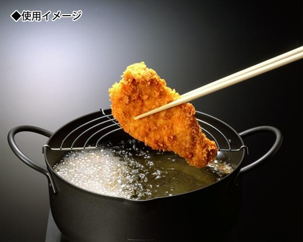 | ノンステッキシリコン塗装を採用することにより、水切れ、油切れが良くお手入れも簡単。深型ですので油ハネが飛び散りにくく、周囲を汚さずに揚げ物ができます。 |