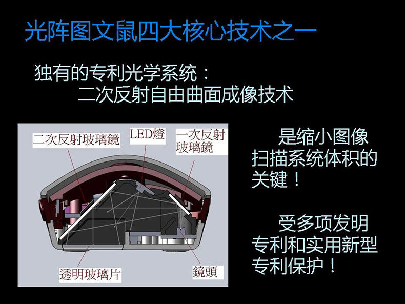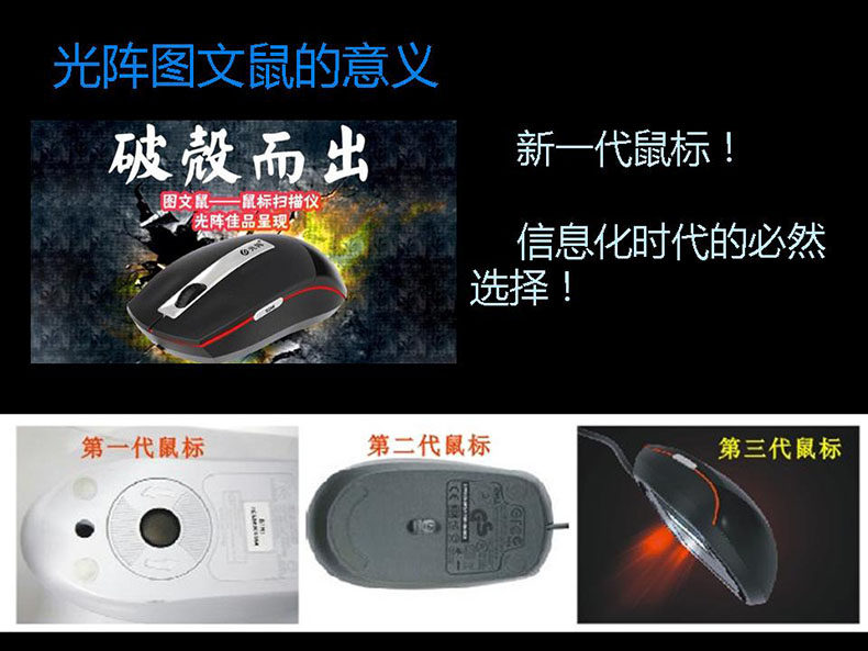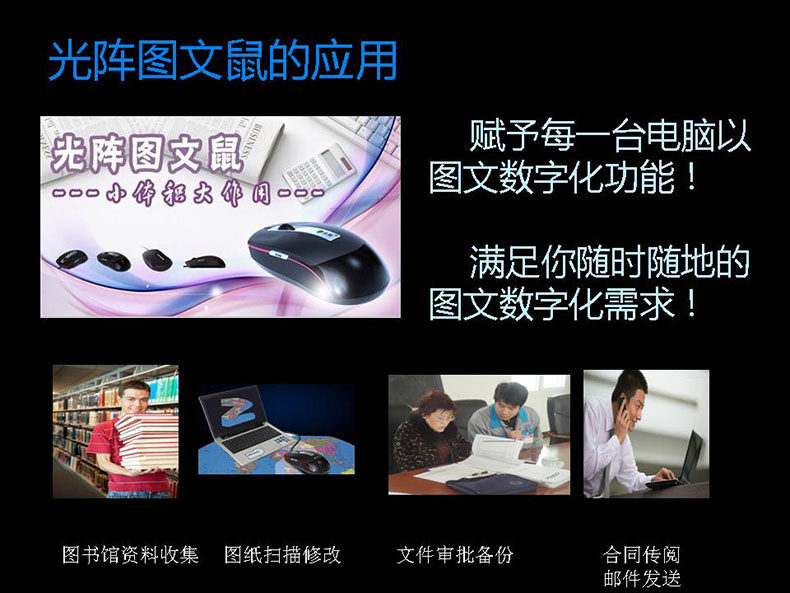光阵鼠标扫描仪——"图文鼠”是光阵公司自主研发创新的专利产品。鼠标扫描仪,顾名思义是拥有扫描功能的鼠标。它巧妙地将鼠标和扫描仪完美融合在一起,具备时尚鼠标和便携扫描仪的双重功能,是真正意义上的智能办公利器。