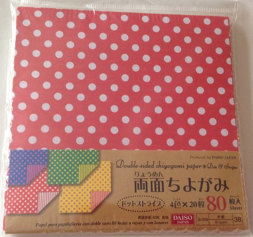-. Binding : Office Product -. Brand : Daiso Japan -. Color : Red -. Feature : 80 Sheets Double Sided Chiyogami Paper / Four Colorways / Dots on one side, stripes on the other -. Label : Daiso Japan -. Manufacturer : Daiso Japan -. PackageQuantity : 1 -. ProductGroup : Office Product -. ProductTypeName : PAPER_PRODUCT -. Publisher : Daiso Japan -. Studio : Daiso Japan -. Title : 80 Sheets Chiyogami Double Sided Chiyogami Origami Paper - Dots and Stripes