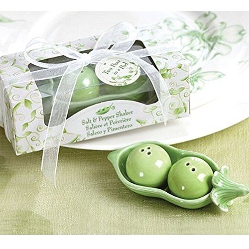- The sweet details and charming gift presentation bring a cheerful touch to your celebration. Features and facts: Green, ceramic salt and pepper shakers in pod-shaped caddy.
