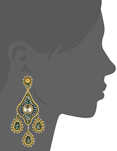 Large chandelier earrings featuring labradorite, glass, and crystal beading at drops and faceted Swarovski crystal centerpiece at first tier