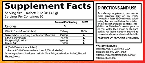 -. Title : Curcumin-C Liposomal Dietary Supplement for Muscle Aches, Inflammation-Curcuma Longa root extract, Vitamin-C with Citrus Bioflavonoids, Black Pepper, Sunflower Lecithin / 30 Sachets, Orange Pineapple