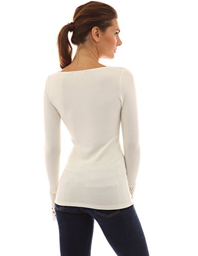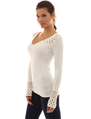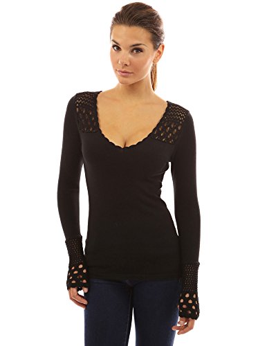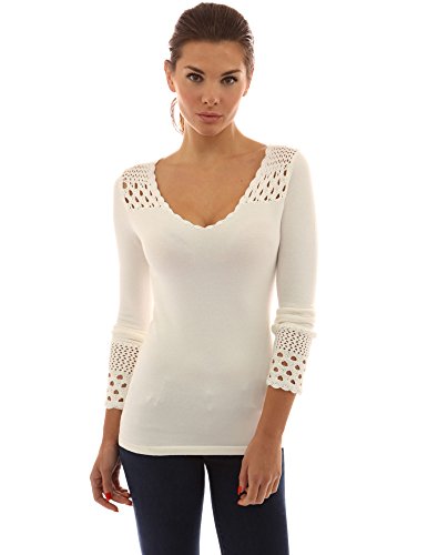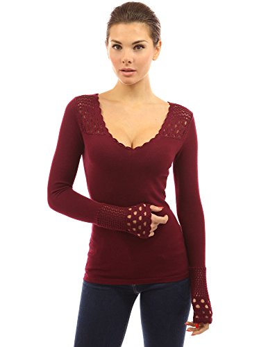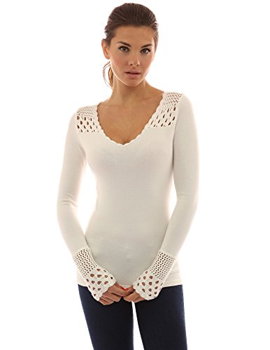 PattyBoutik Crochet Eyelet Lace Inset V Neck Long Sleeve Ribbed Knit Top. Model in pictures is 5 feet 8 inches (173cm) tall wearing size S.