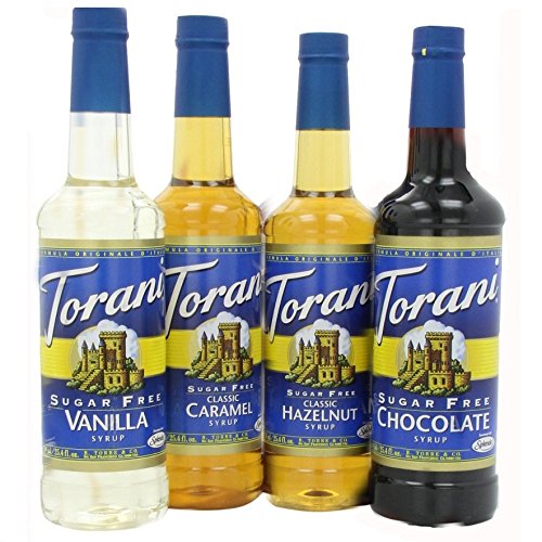 TORANI SUGAR FREE SYRUP VARIETY PACK FOR COFFEE, 25.4 OUNCE (PACK OF 4) ONE EACH OF SUGAR FREE: VANILLA, CARAMEL, HAZELNUT AND CHOCOLATE