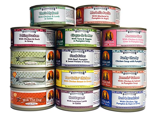 Weruva Dog Food 14 Flavor Variety Pack (Grandma's Chicken Soup, Wok the Dog, Peking Ducken, Amazon Liver, Steak Frites, Funky Chunky, Cirque de la Mar, Paw Lickin' Chicken, Jammin' Salmon, Marbella Paella, Green Eggs & Chicken, Bed & Breakfast, That's My Jam, and Hot Dayam!)