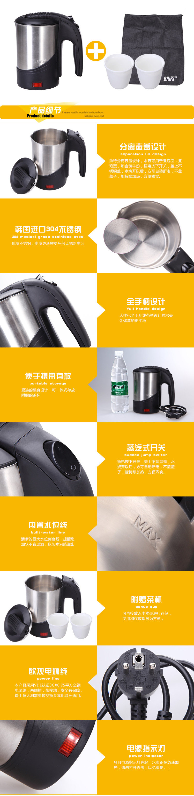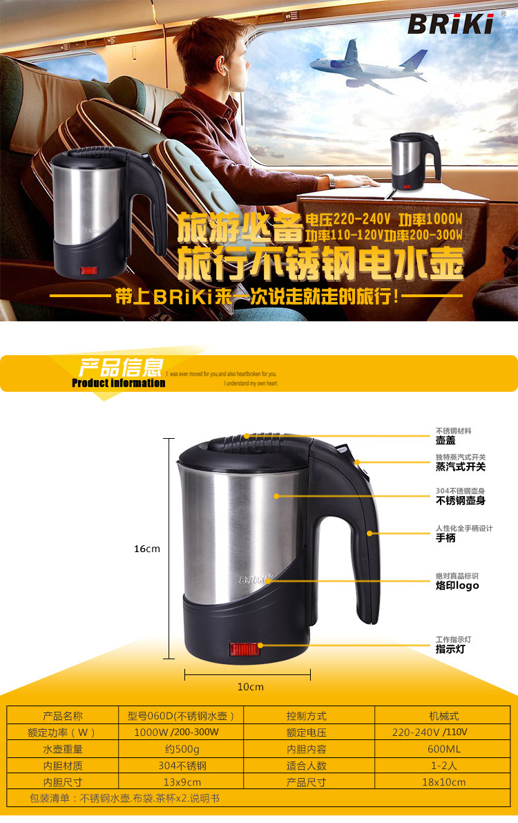 Stainless steel inner cover, capacity 0.6L, weight 500 grams or so, small size, easy to carry. Universal electric kettle voltage 110v-220v, removable cover, Hukou large diameter design, easy to clean.