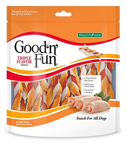 -. Binding : Misc. -. Brand : Dog Treats -. Color : Multicolor -. EAN : 0715658265946 -. Feature : Long-lasting entertainment. Long-lasting treat with 3 flavors that dogs crave / Made with real rawhide, pork hide, chicken. Good 'n' Fun Kabobs are high in protein / Healthy and delicious way to satisfy your dog's natural urge to chew / Good 'n' Fun dog treats are manufactured under strict food safety guidelines -. Label : Kardin -. Manufacturer : Kardin -. Model : KARDIN-H-92240H-8.6 -. MPN : HH-92240-TD -. PackageQuantity : 1 -. PartNumber : HH-92240-TD -. ProductGroup : Pet Products -. ProductTypeName : PET_SUPPLIES -. Publisher : Kardin -. Size : 8.6 oz. -. Studio : Kardin -. Title : Healthy Hide Good 'n' Fun Triple Twists Snack For Dogs Treats, 8.6 oz. -. UPC : 715658265946