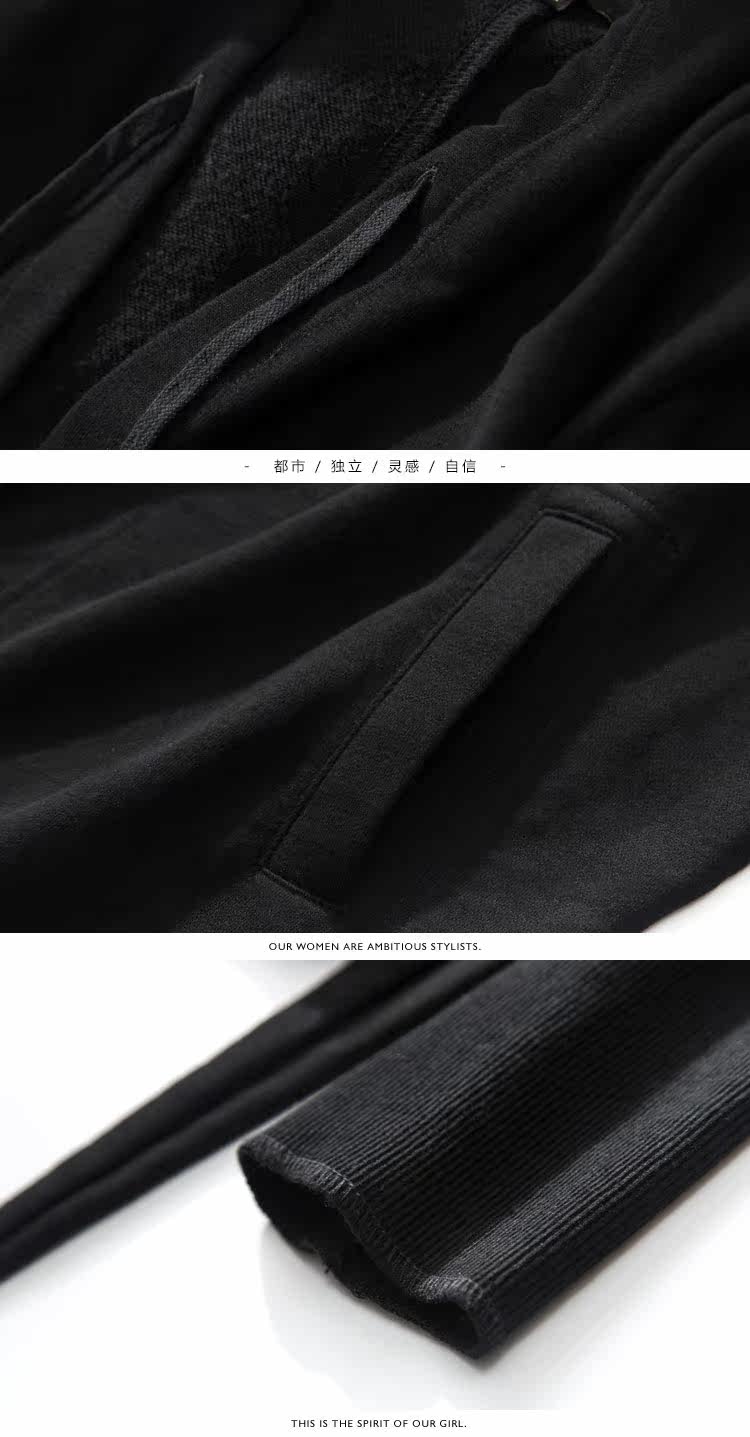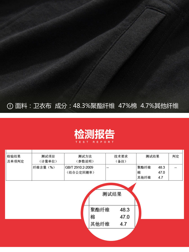 | 面 料:面料:48.3%聚酯纤维 47%棉 4.7%其他纤维 罗纹:97.9%棉 2.1%氨纶颜 色:黑色 |