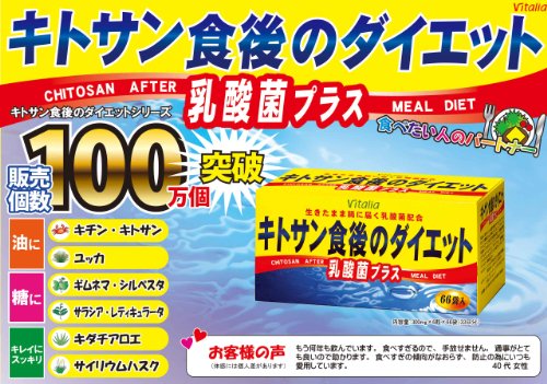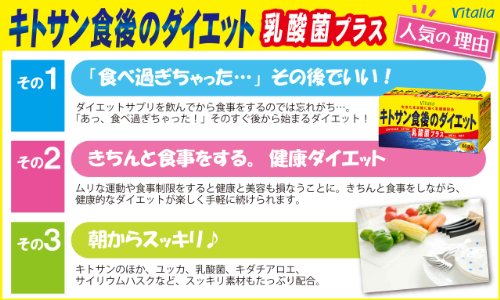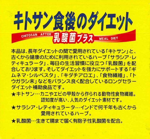 「キトサン食後のダイエット乳酸菌プラス」は長年ダイエットで愛用されている「キトサン」と、古くから健康の為に利用されているハーブ「サラシア」に、毎日の健康習慣をサポートする「乳酸菌」「食物繊維」はじめダイエットをサポートする素材をバランスよく配合した商品です。