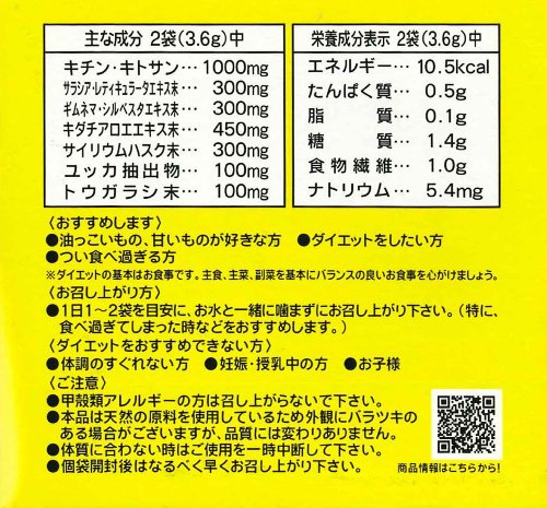 1日分(2袋)にキトサン1000mg、サラシア・レティキュラータ300mg、乳酸菌約2億個(製造時)、ギムネマ・シルベスタ300mg、キダチアロエ450mg、サイリウムハスク300mg、ユッカ抽出物100mg、トウガラシ末100mgを配合。