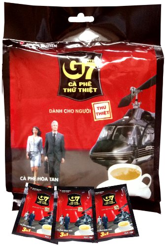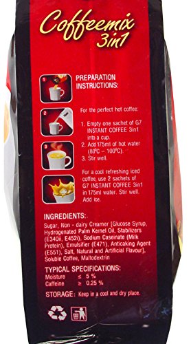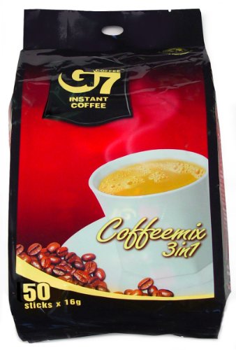 G7 3-in-1 Gourmet Instant Coffee has become SE Asia's most popular instant. Developed at a $10 million plant in the Buon Me Thuot highlands, this gourmet instant is never brewed, never freeze-dried or concentrated. With non-dairy creamer and sugar, this is an instant coffee all ready to go just by adding 6 ounces of hot water. Millions of G7 fans carry G7 with them to be able to make a perfect cup of coffee anywhere, any time. Creates a 6 ounce cup depending on the strength you prefer. 16 gram serving, 50 servings per bag.Feature