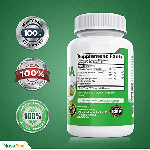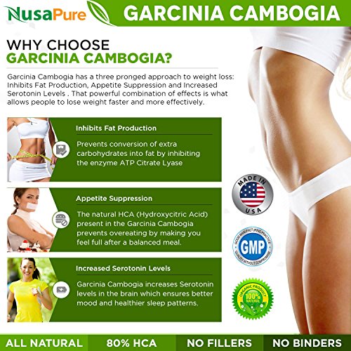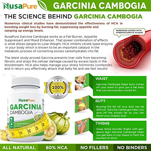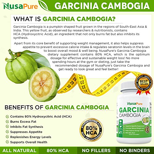 -. Feature : POWERFUL GARCINIA CAMBOGIA EXTRACT 80% HCA: The best natural supplement for weight loss. Get effective, measurable results naturally. / MAX HCA: HCA is the active ingredient in Garcinia Cambogia. Our product has 80% Pure HCA: superior to products other vendors sell. Each serving has 1400mg of pure Garcinia Cambogia Extract / 100% ALL NATURAL, SAFE SUPPLEMENT: Combined with a healthy diet, Garcinia Cambogia has been show to help you slim down, detox, suppress your appetite, and block fat from Metabolizing. Lose weight the healthy, natural way / SCIENTIFICALLY FORMULATED: All of our supplements undergo extensive quality control testing before being sold. We use only FDA regulated and GMP certified manufacturing facilities in the USA. / 100% LIFETIME RISK-FREE GUARANTEE: If you are unsatisfied with the results of NusaPure's Garcinia Cambogia you can get a complete, no-hassle refund. Click Add to Cart to kick start your weight loss now!