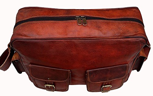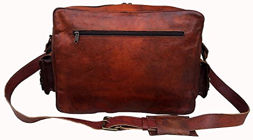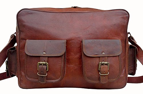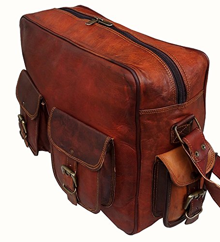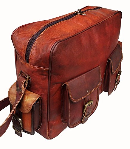 Product Description ? Brown Leather Laptop Messenger Bag with easy access pockets in front ? Ideal for 16-inch or smaller laptop, macbook or any flat screen device. Inner walls of the central compartment are padded to provide extra cushioning to the device ? Can also additionally store files, books, mobile , tablet, laptop charger, etc. ? Very spacious and keeps your stuff organized with Internal compartments ? 2 additional front pockets. ? 1 Adjustable Strap with Max Length 55 Inches ? Dimensions: 16"(W) x 12"(H) x 4"(D) 0