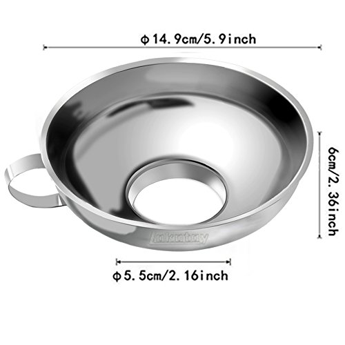 2. Special Design Wide Mouth Design --A big helper in the kitchen! Works great with wide mouth canning jars! Wide stem opening allows large food items to pass through easily when packaging wide mouth canning jars. --It can also be used to strain out larger solids by placing a mesh strainer on top. Perfect for reusing cooking oils, and infuse vinegar with herbs. Metal Ring--The metal ring is specially designed for storage, you can hang it on the wall and save space. Besides, while you pouring hot oil or other high temperature things, you can just hold the ring to protect your hands. 0