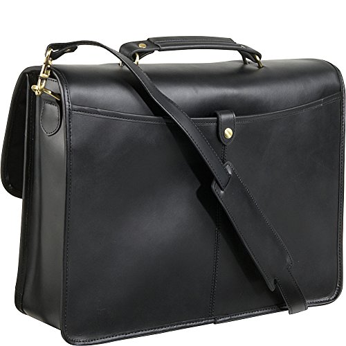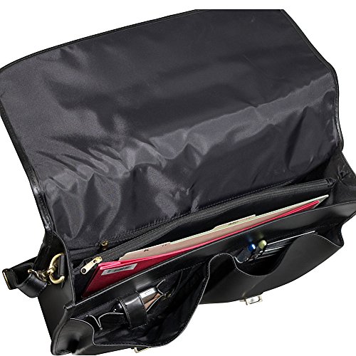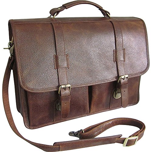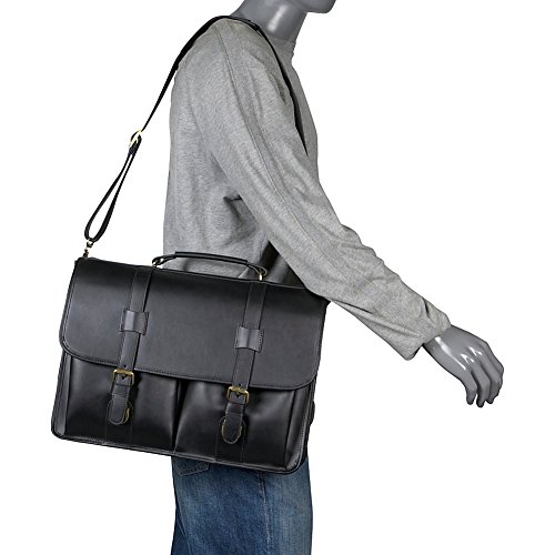 -. Feature : Cowhide leather, PU top coating / Double slide latch behind front buckles / Two classic snap-on buckle locks / Two large front double-gusset pockets / Center zippered divider