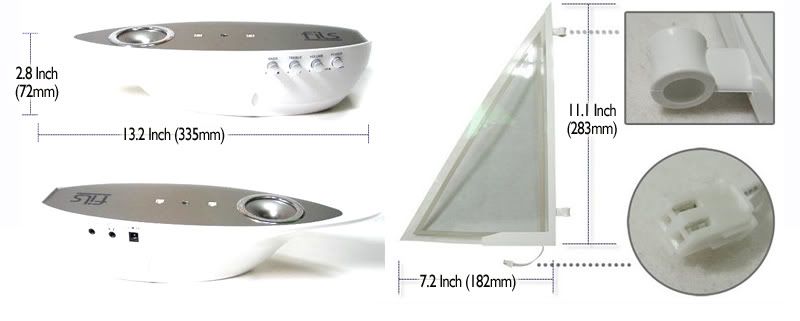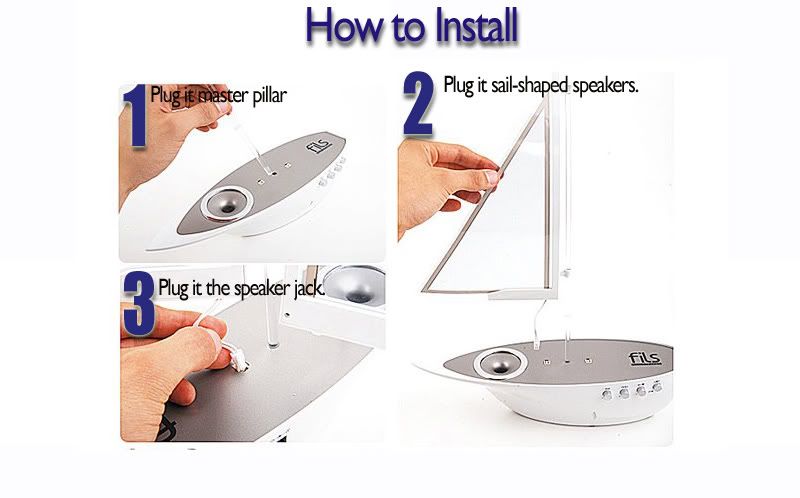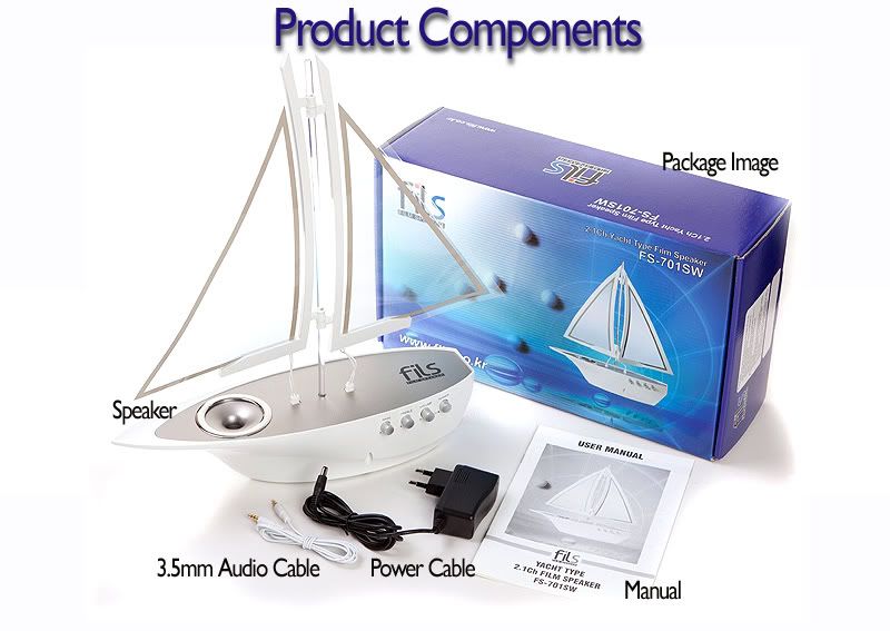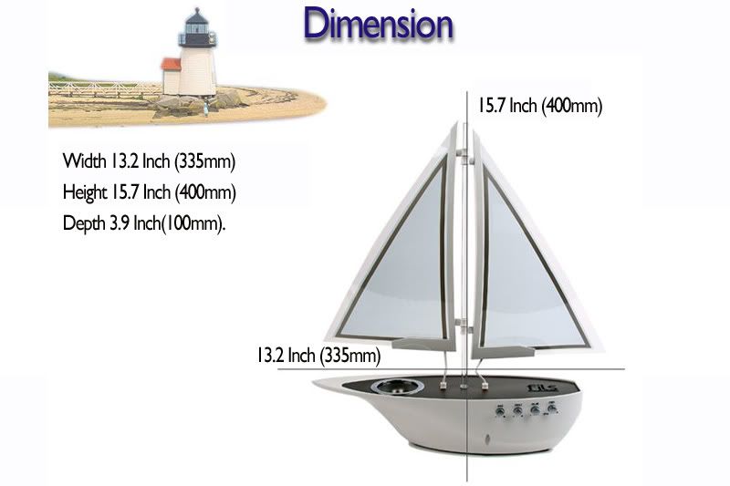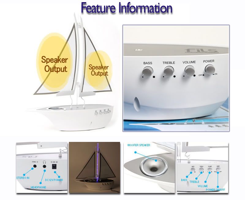 Offering 2.1 sound via its sails (each sail serving as a left and right channels rated at 7.5 watts each) with a 15 watt woofer mounted in the boat’s base, the FS-701SW comes with separate bass and treble controls and with a standard audio in jack with which you can hook up a wide variety of audio sources – from PCs to iPods and other MP3 devices.
