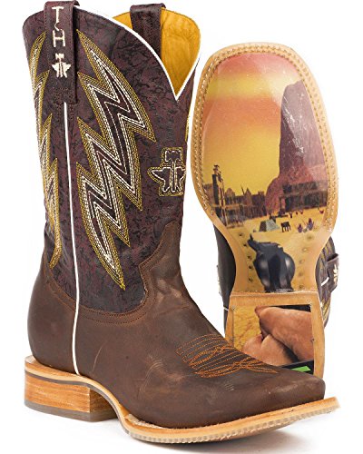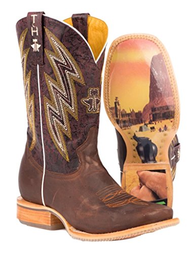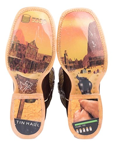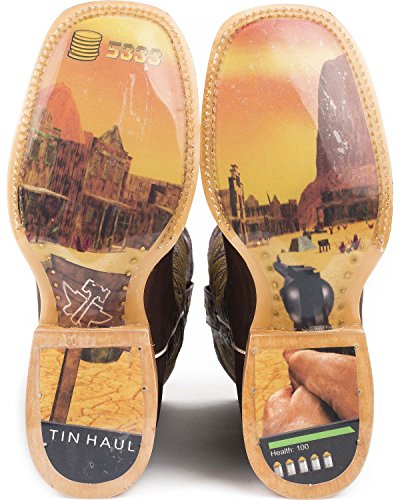 Studio : Tin Haul Publisher : Tin Haul Binding : Apparel Product Description Make a statement with your footwear in Tin Haul Cowboy boots. These killer Gunslinger boots are handmade from premium leather and feature an oily brown vamp paired with a marbled wine shaft and zig zag stitching. Kick up your feet to reveal one of Tin Haul's signature outsoles featuring a fun, old western gunslinger graphic. Stand out from the crowd in these unique boots by Tin Haul. 0