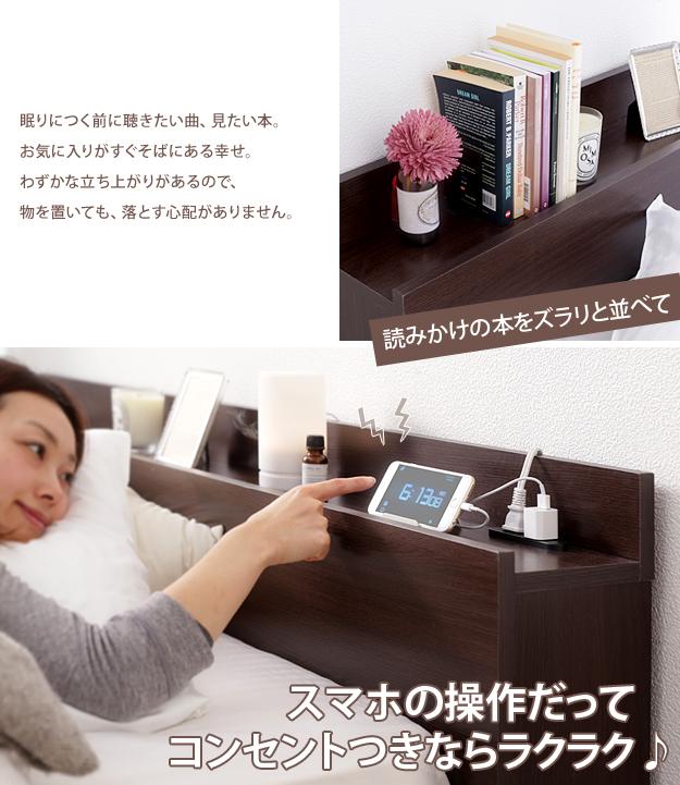 商品について:【フラットな床面で布団、マットレスどちらでも使えるベッドです】床面がフラットなためマットレスを使用してもメイキングが楽にできます。棚にはホコリ侵入防止用のフタが付いた2口コンセント付き(1500W)。