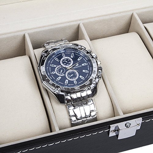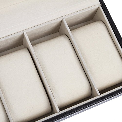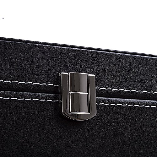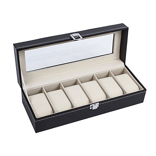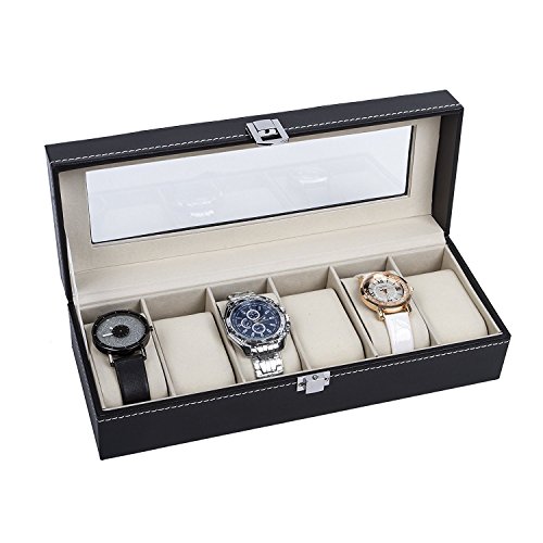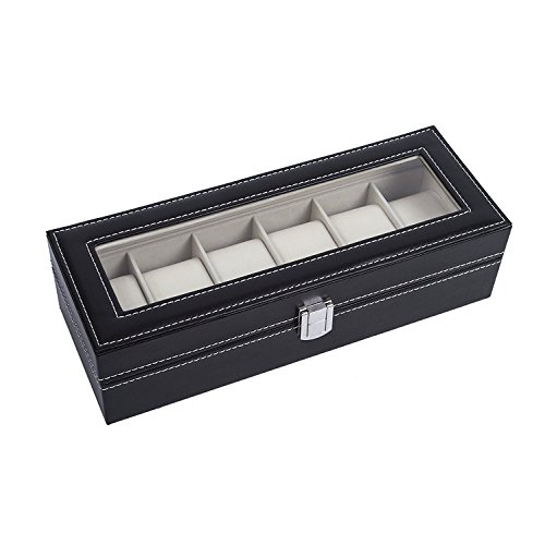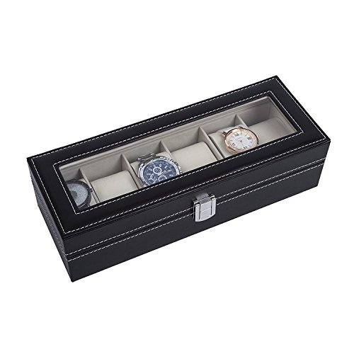 IMIEE Carbon Fiber Black Finish Watch Case, Jewelry Box Collection Storage, Glass Top, Holds 6 Watches