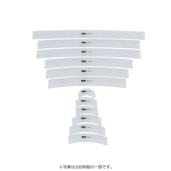一枚一枚の定規にはそれぞれの曲線を表す弧の半径(アール)がmmで刻印されています。 製造国:日本 素材・材質:アクリル 仕様:最大長さ:400mm厚さ:2mm100枚組 ※サプライヤー直送品 ご注文後2~3営業日後の出荷となります【商品名】アール定規 アクリル製 100枚組 1-816-0100