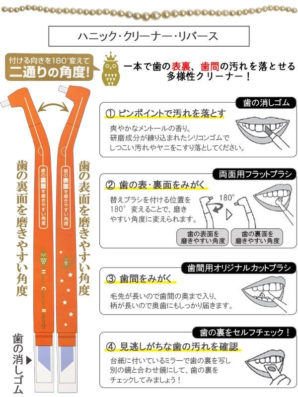 | 仕様 | 【ハニック・クリーナー・リバース】 本体サイズ:約Φ1×長さ17cm 耐熱温度:80度 ブラシの硬さ:ふつう 替えブラシ2個付き 【薬用ハニックホワイトB-HCR】 医薬部外品 |