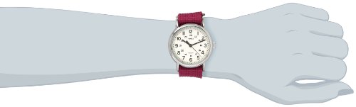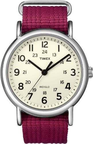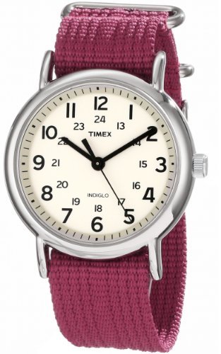 Amazon.com Product Description The Timex Women's Weekender Fuchsia Slip Through Strap Watch offers casual, yet fashionable styling for the relaxed lifestyle. The fuchsia colored slip through strap makes this an ideal accessory for any wardrobe. The 24 hour time and Indiglo night-light make this timepiece truly unique. The 38mm silver-toned brass case holds the dial, which is protected by a hardened mineral crystal and features Arabic hour markers at the 3, 6, 9 and 12 'o clock positions. For reliable timekeeping, the watch hands are powered by analog quartz movement.