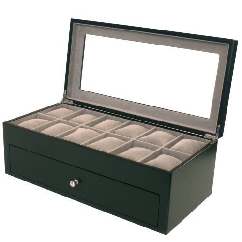 Studio : Tech Swiss Publisher : Tech Swiss Binding : Watch Product Description Showcase your timepieces in this rich black matte finish Montego extra large chest for 20 watches. The Montego large watch box is a well-designed to accommodate extra large watches (Fits Watches: up to 67mm) by providing XL wide compartments, soft pillow cushions to fit both men and ladies watches and extra high clearance for oversized timepieces. The meticulously made watch chest comes with two levels with 10 compartments on the upper shelf and the lower drawer that pulls out for additional 10 watches. The interior is lined with a grey colored faux suede lining and each compartment comes with a soft removable pillow cushion. The lid is inlaid with a Lucite window and is attached by two silver-tone hinges. This attractive looking chest is an efficient way to store all sizes of timepieces. The bottom of the chest is lined with velvet to prevent scratches on surfaces. Watch box can be placed on a desk, table, night stand or dresser. Case Dimensions: 14 1/2" L x 8 1/2" W x 7 1/2" H Top Compartment Size: 3 3/4" L x 2 1/2" W x 3 3/4H Lower Drawer Compartment Size: 3 3/4L x 2 1/4W x 2 1/2H Exclusively by Tech Swiss