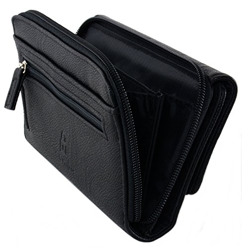 Feature : Measurements 7.5" x 4.5" x 1.25" - Faux Pebble Grain Leather / RFID Protector Shields your Credit Cards and Personal Information from Theft / Front Flap Over Section with 2 Snap Closure to hold items securely even when fully packed / Accordion Expanding Zip Around Back Compartment w/ 2 Section Divider, Back Easy Access Slip Pocket and Zippered Pouch / Interior Checkbook Cover, 2 ID windows, Photoflips w/ 4 Windows, Pen Loop, 8 Card Slots