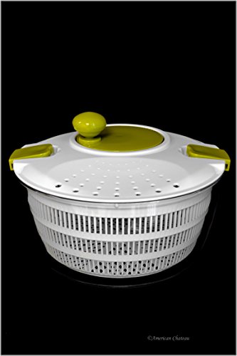 -. Feature : Large Salad Spinner with Strainer Lid / Plastic Construction / Spinning Knob / Gift Boxed / Approximate Size: 9.5" x 9.5" x 6"