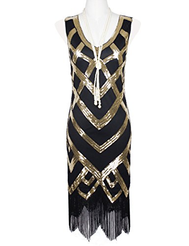 KAYAMIYA Women's 1920S Sequined Beaded Embellishment Gatsby Prom Dress Large Glitter Black Gold