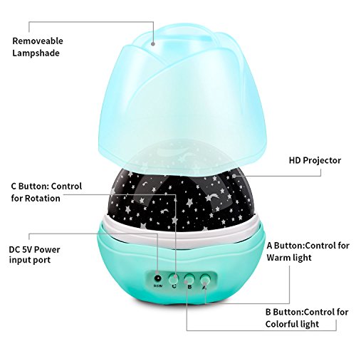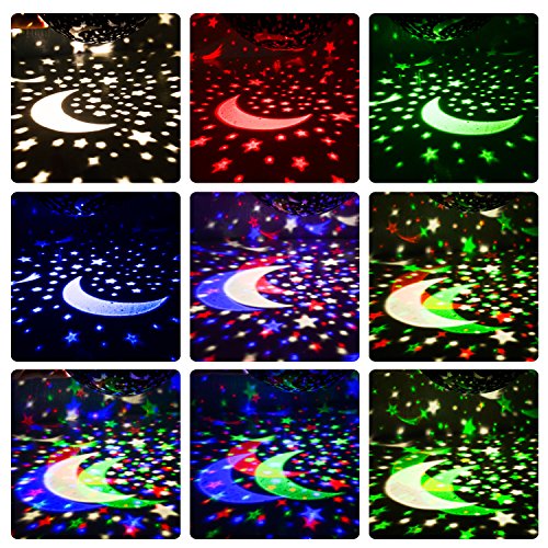 【Starry Projector Light 】The multicolor options moon stars projector light with 360 degree rotation will bringing you a brilliant light show on your ceiling or walls, more closer,more effective. there will be different colorful space, to create an enjoyable and relaxing bedtime experience for children, nursery and comfort kids to sleep, also perfect for adults to decorate your room.