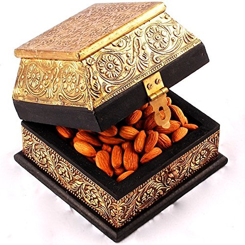A wooden box covered with an ornamental & intricately carved brass sheet. Used as a decorative box for storing jewellery, dry fruits, knick knacks, this is an adornment in itself kept atop the dining table. Brass work on wood is a craft form prevalent in rajasthan and up. A thin brass metal sheet is first repoussed (hammered from the reverse side to create a low relief) and then chased (refined on the front side) to present intricate designs. The sheet is then glued and nailed onto a wooden article & oxidization is done to give an antique look. Size 5x5x5 inches. Perfect birthday, anniversary gift for her.