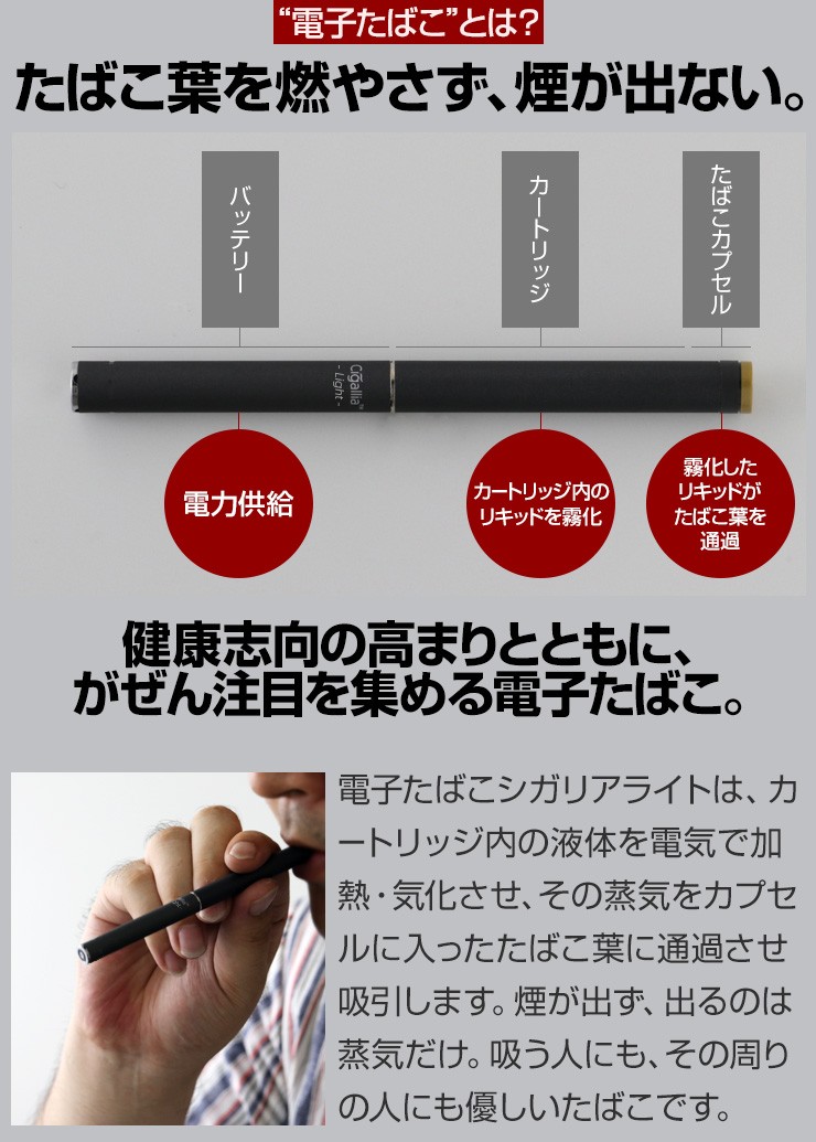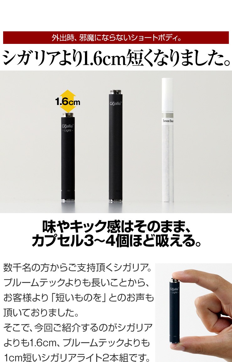 あのシガリアライトが、お得な2本セットに。外出時にも、2本持ちで便利に。【特徴】●充電が切れたら困る外出時の予備バッテリーとして●バッテリー充電時の予備バッテリーとして●繰り返し使用して充電が切れやすくなったバッテリーの交換用として●たばこカプセル交換時期のお知らせ機能付きデジキン